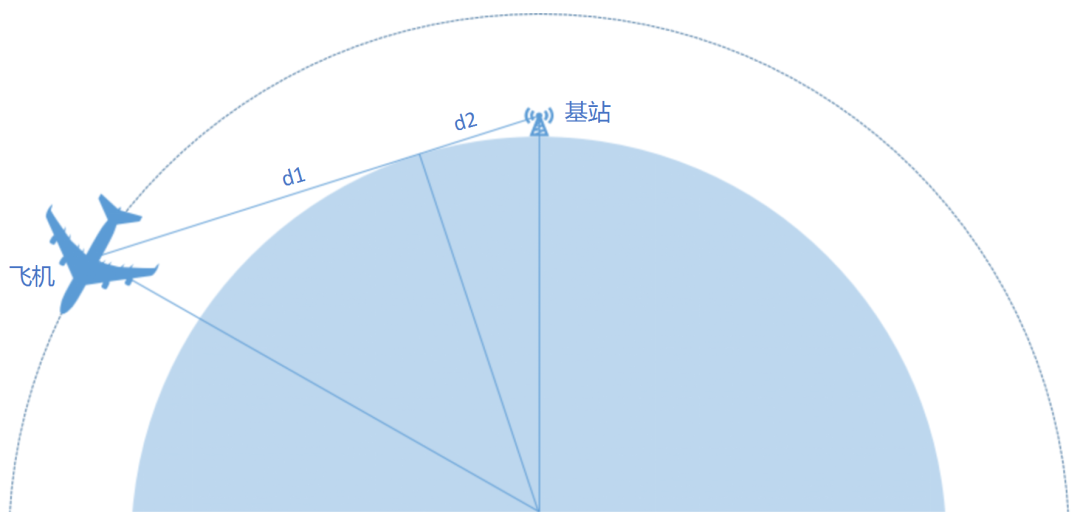 如圖所示,從基站的高度向地球作切線,并延長該線直到和飛機在天上的巡航高度相同,便得到了基站的天空覆蓋半徑:d=d1+d2。